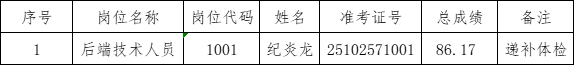根据《2025年卢氏县莘云数据科技有限公司公开招聘工作人员的公告》的相关要求,因后端技术人员岗位考生自动放弃体检资格,导致招聘岗位出现空缺,现按考试总成绩由高分到低分的顺序递补,现将递补体检名单公示如下: